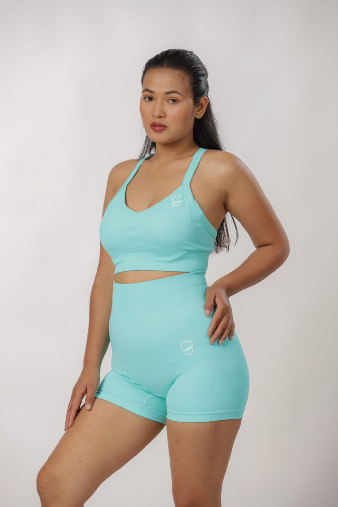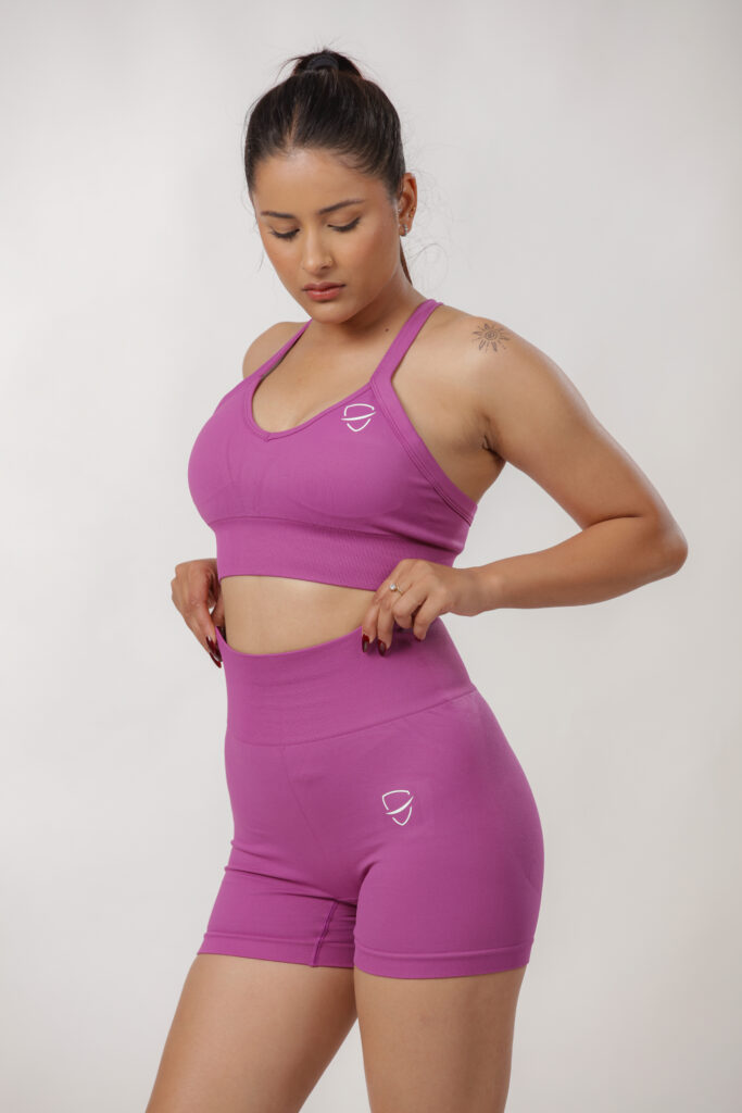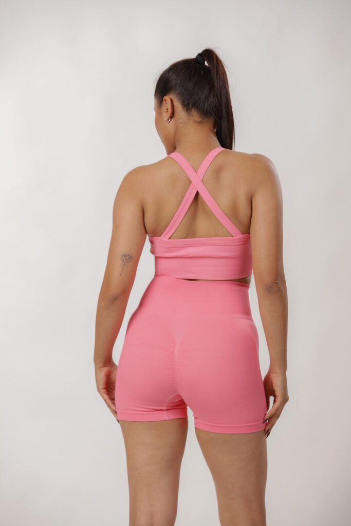 Strappy back sports bra and shorts set made from a soft polyamide-elastane blend, combining a sleek back design with a comfortable, supportive fit.