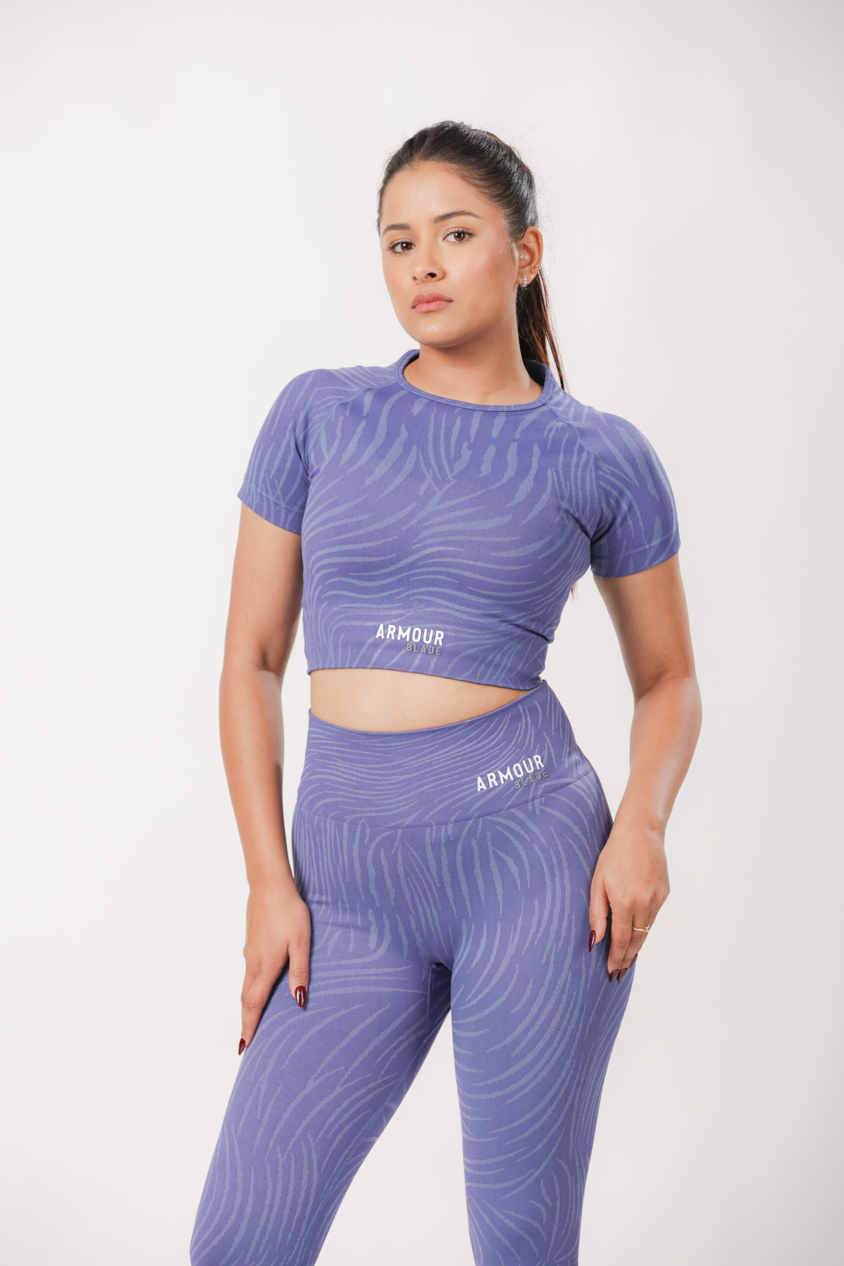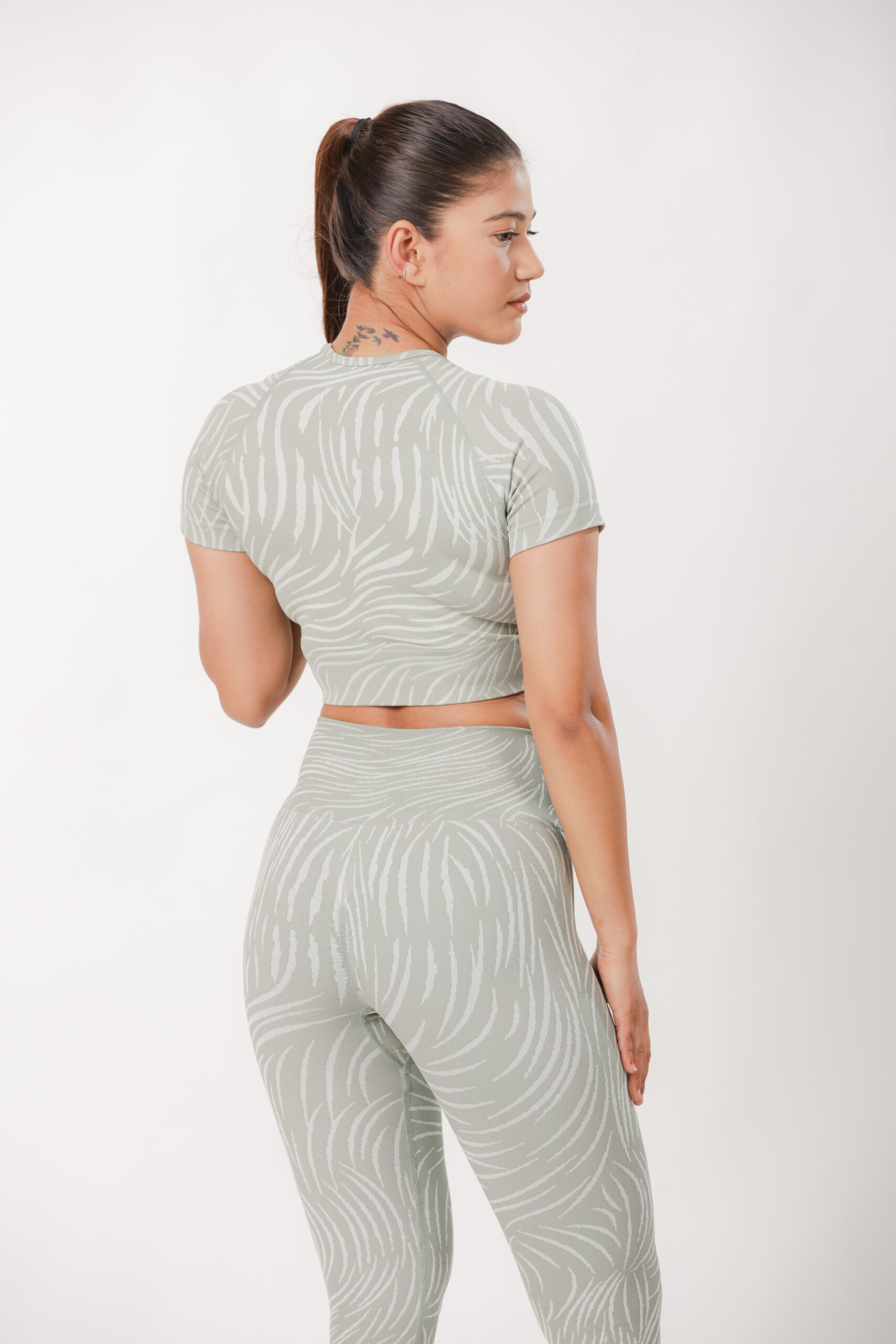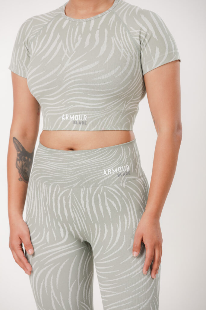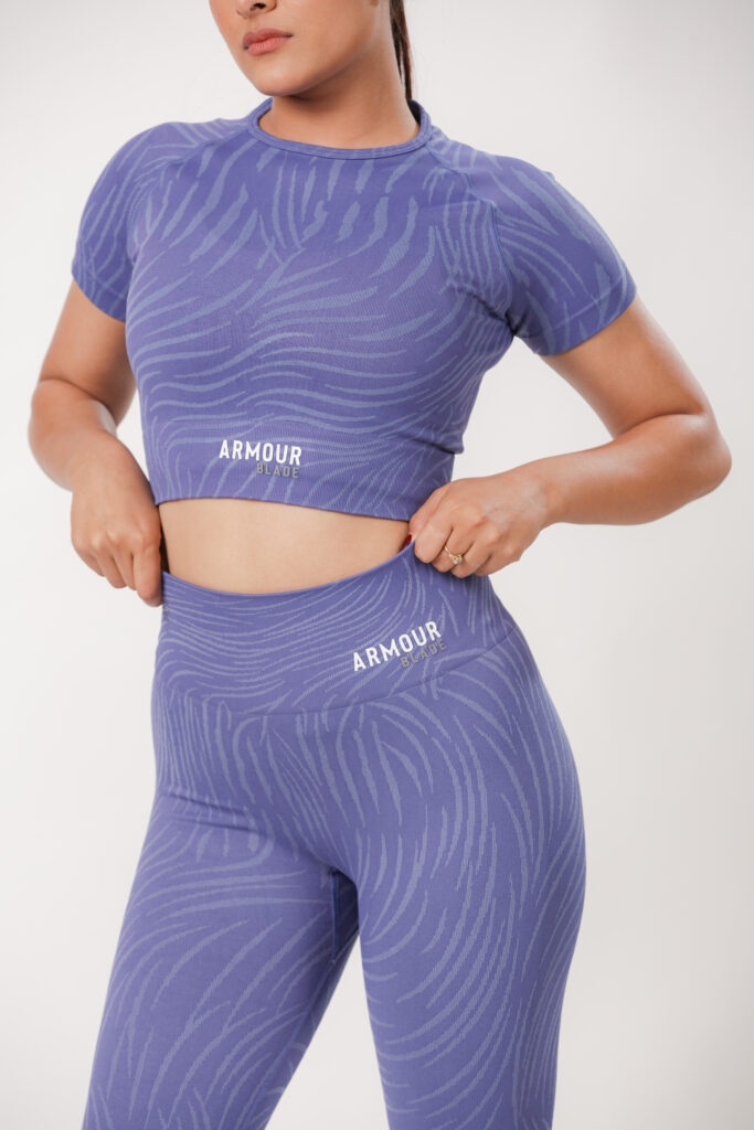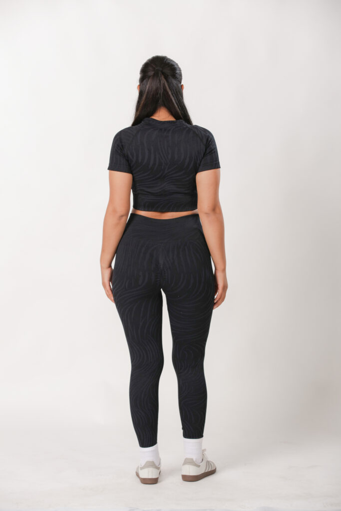 Short sleeve top and leggings set with a tiger print design, made from a stretchy, comfortable polyamide-elastane blend for a supportive, flexible fit